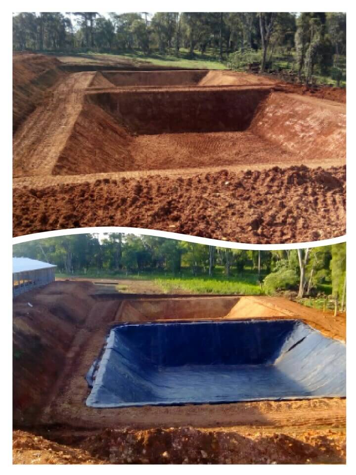 A impermeabilização das esterqueiras são feitas com Geomembrana de PEAD, em diversos tamanhos. Possibilitando o armazenamento correto dos dejetos para sua fermentação, diminuindo seu poder poluidor. Melhorando o seu aproveitamento como fertilizantes em lavoura e pastagens.